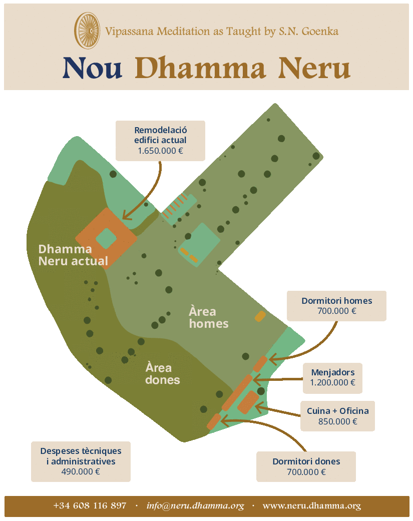 Goenkaji el va anomenar "Dhamma Neru", Dhamma Neru significa "Muntanya Celestial del Dhamma". La construcció quadrangular de Dhamma Neru s'alça enmig d'un terreny pla de 1,5 hectàrees envoltat per alts arbres, amb fruiters i plantes ornamentals a l'interior.